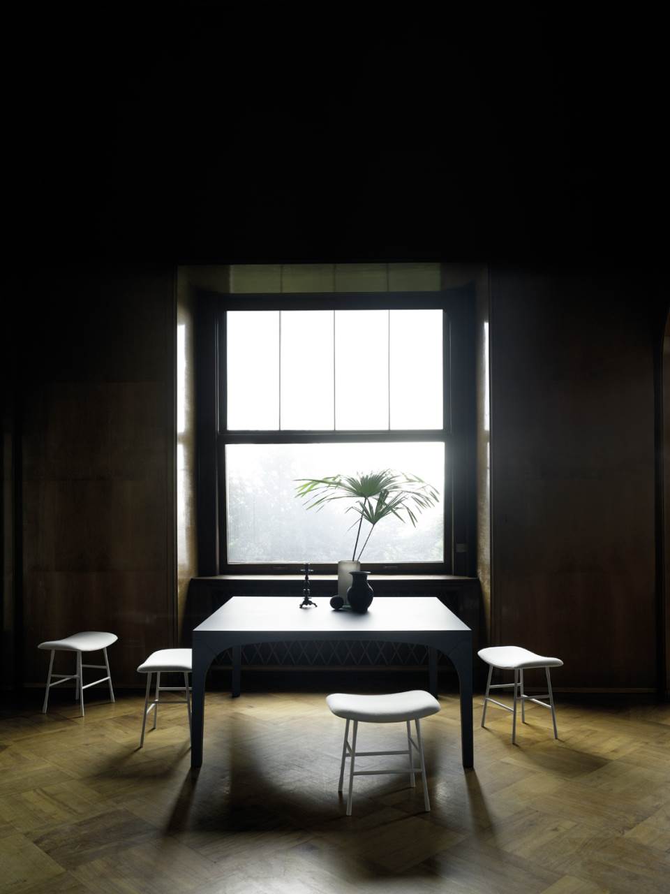 Discreet elegance and comfort for Hinge, stool available in two heights.